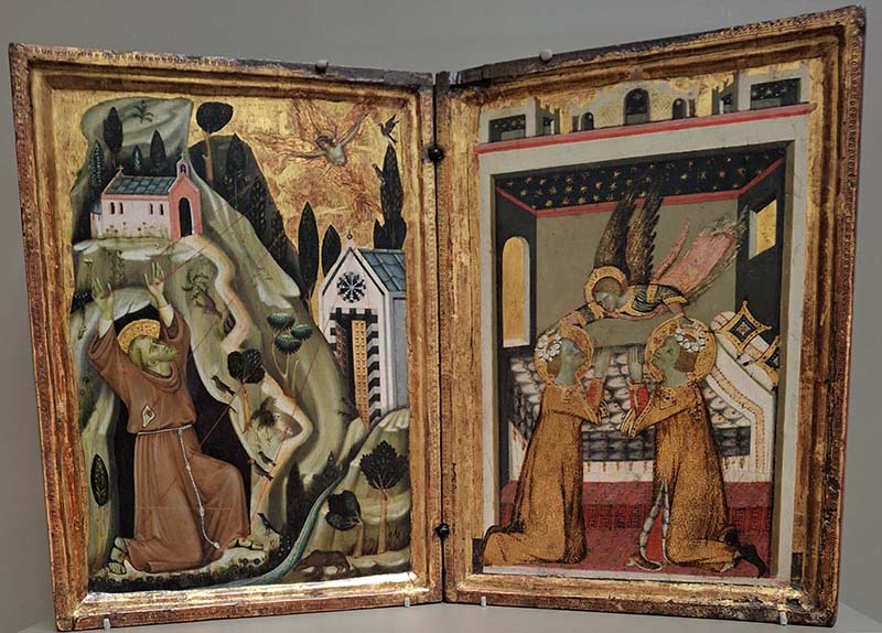Delicately painted and small enough to hold in one's hands, this panel was probably crafted to complement the private devotions of a single owner, the Blessed Delphine de Signe. While contemplating it, the pious Delphine could meditate upon her chaste marriage, modeled after that of Saints Cecilia and Valerian (right), and upon her membership in the Franciscan lay order founded by Saint Francis