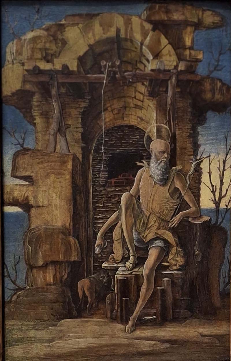 Seated before the vaulted ruin of his hermitage, Saint Jerome contemplates a crucifix. The scorching heat of the desert sun is evoked by a thin application of real gold to parts of the painted surface. Despite his careworn features and languid pose, Jerome’s taut limbs convey his vitality. Small, refined, and costly, paintings such as this one were prized by the ruling court in the artist's native Ferrara. Jerome, a scholar, embodied the union of Christian piety and classical education that so appealed to the cultivated elite. His lion companion, rump turned toward the viewer, betrays a hint of drollness characteristic of Ferrarese courtly taste.