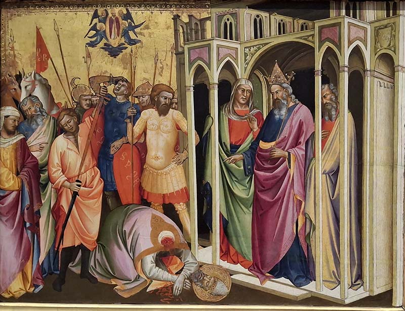 Originally part of an altarpiece for the church of San Gaggio in Florence, this scene depicts the death of the church’s namesake, Caius (“Gaggio” in the local dialect). The pope’s decapitation was ordered by the Roman emperor Diocletian in A.D. 296. For this unusual subject, the artist employed daring color contrasts and created the illusion of receding space by setting the palace architecture at an angle.