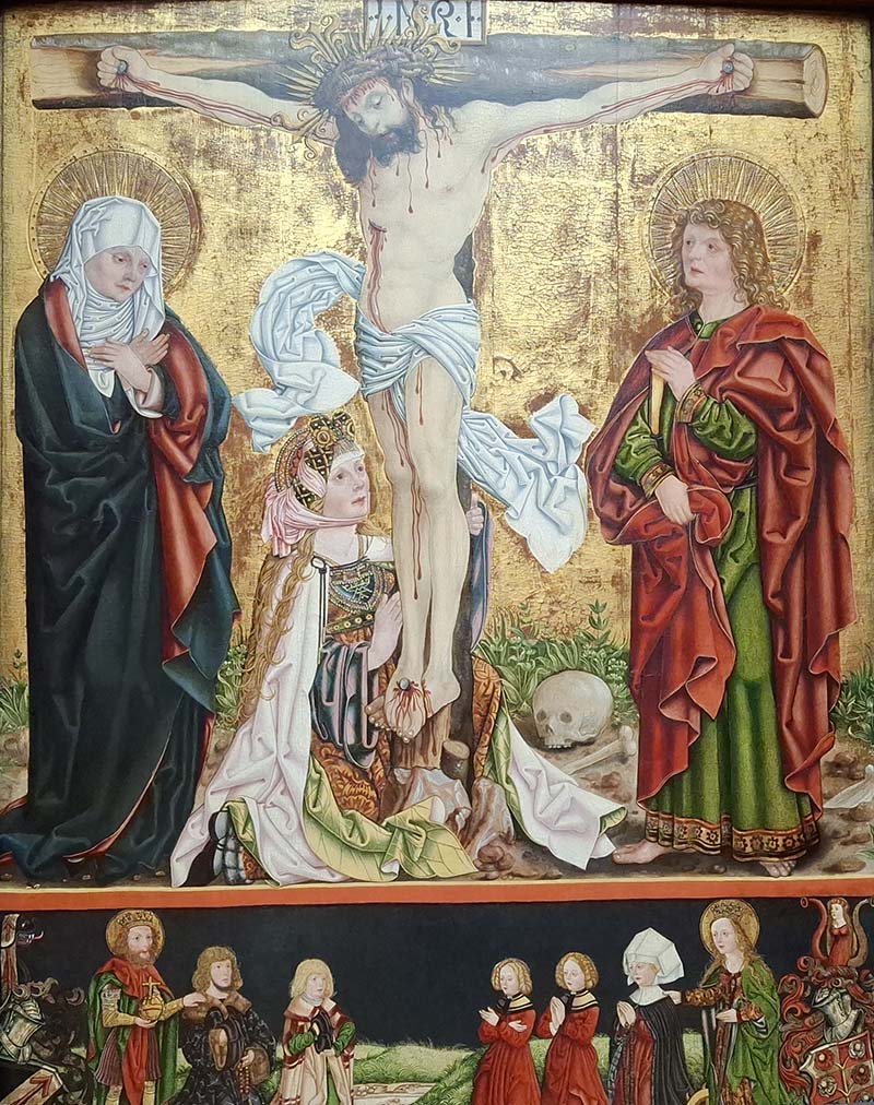 This dramatic painting originally hung in Nuremberg’s St. Sebald church, where it commemorated the death of Katharina Held. Christ’s mother, the Virgin Mary (left), and Saint John the Evangelist (right) grieve over Christ’s suffering and death on the cross. Their mournful expressions inspired the compassion and prayers of Catholic worshippers. The elaborate dress of the penitent Mary Magdalen (center) and the gold background reference the style of older devotional paintings. Kneeling in the lower register, flanked by saints and coats of arms, are the merchant Sigismund Held (left), Katharina’s husband and patron of the painting, Katharina herself (right), and their children.