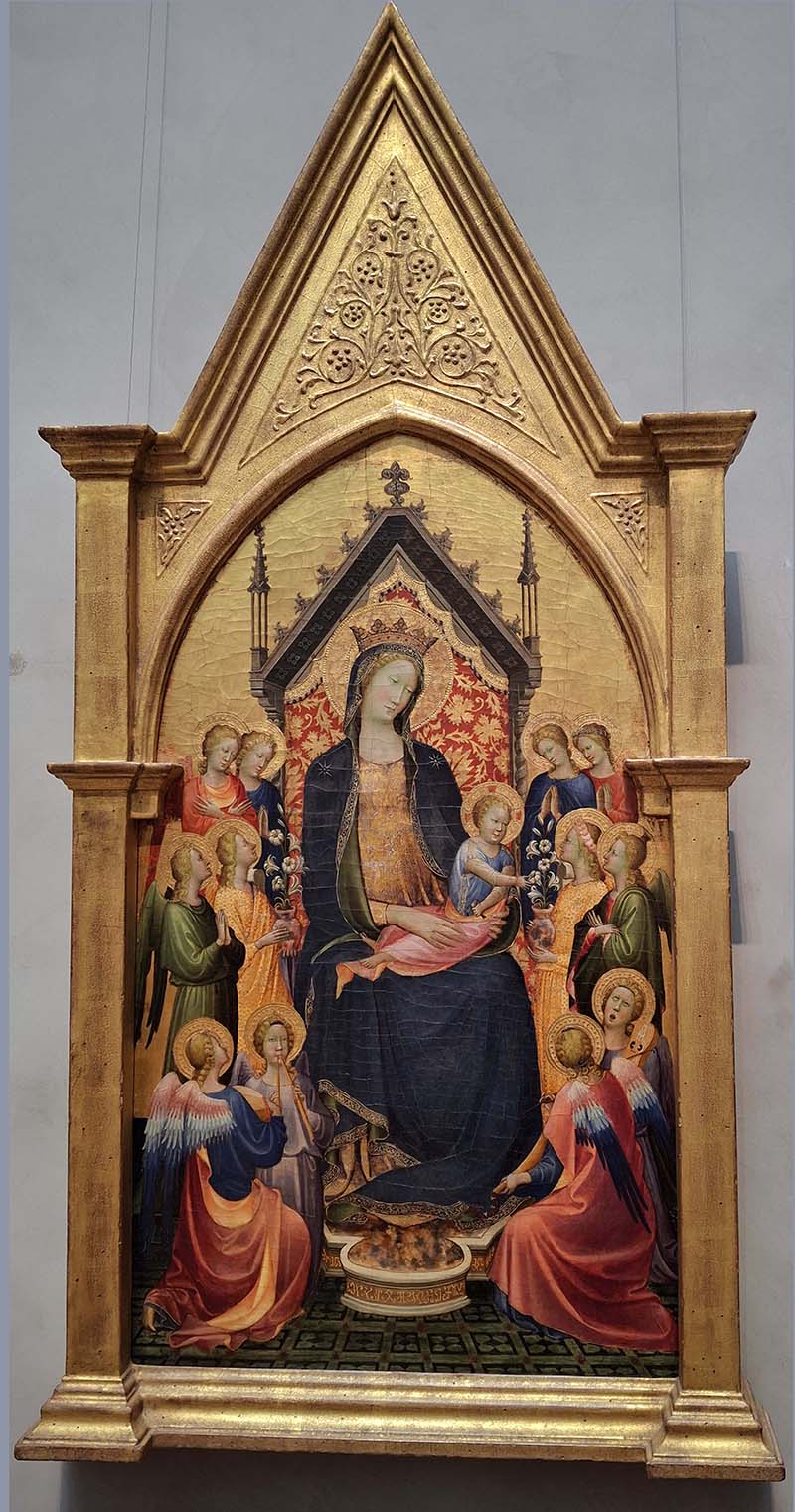 The Virgin, enthroned as Queen of Heaven, is adored by angels in colorful robes. Wriggling in his mother’s lap, the infant Christ reaches for a lily, symbol of Mary’s purity, and clutches a goldfinch, an allusion to his future Crucifixion. Starnina created an especially sumptuous image through effects such as gold punchmarked ornamentation, simulated marble, and geometrically patterned tiles. The luminous background symbolizes heaven.