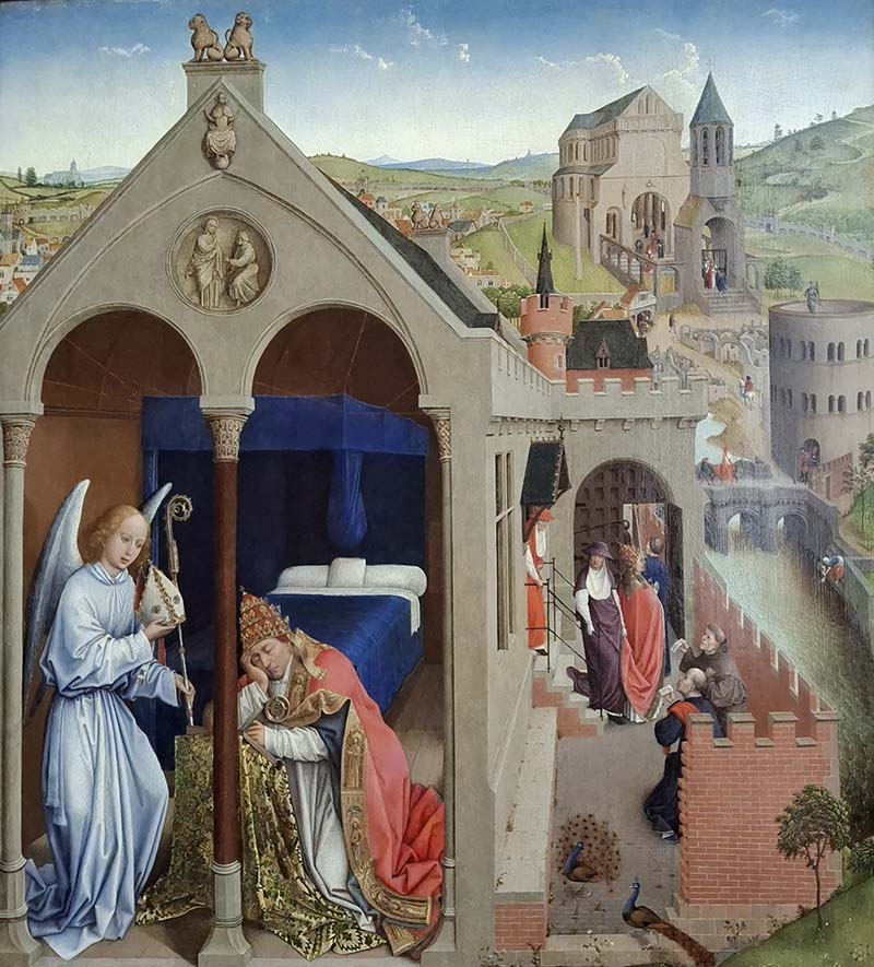 The attention to detail and clarity of line in this painting recall Rogier van der Weyden’s remarkable illusionistic style. The panel depicts the early life of Saint Hubert, who was visiting Rome when Saint Lambert, bishop of Maastricht, was killed (about A.D. 708). An angel tells the sleeping Pope Sergius of Lambert’s murder and, presenting him with the bishop’s miter and crozier, instructs the pope to name the pilgrim Hubert as Lambert’s successor.