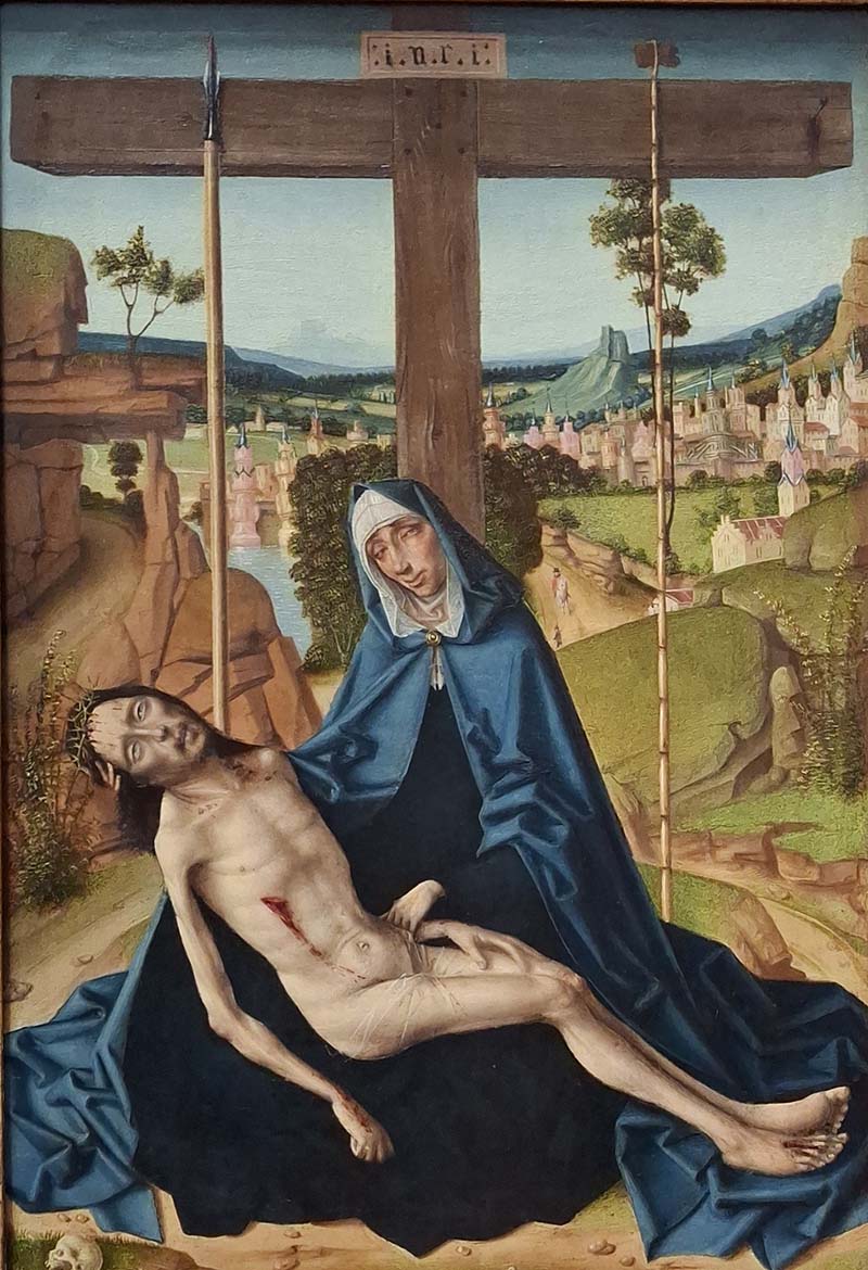 Description: The realism and meticulous rendering of detail in the figures and landscape of this work are characteristic of late fifteenth-century Netherlandish painting, which was often emulated by Spanish artists. However, the unknown Spanish painter who created this panel deliberately exaggerated Christ’s broken body and the Virgin’s overscale figure and grief-stricken features in order to intensify the physical and emotional anguish central to the theme.