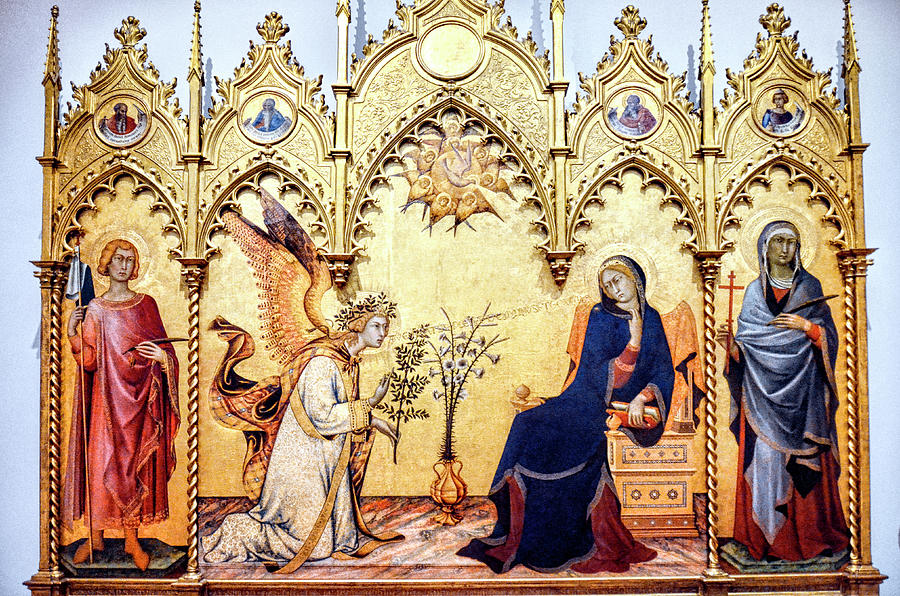 The Annunciation: Famous for the "Gothic curve" of the Virgin’s body as she recoils in modest surprise from the Angel Gabriel.