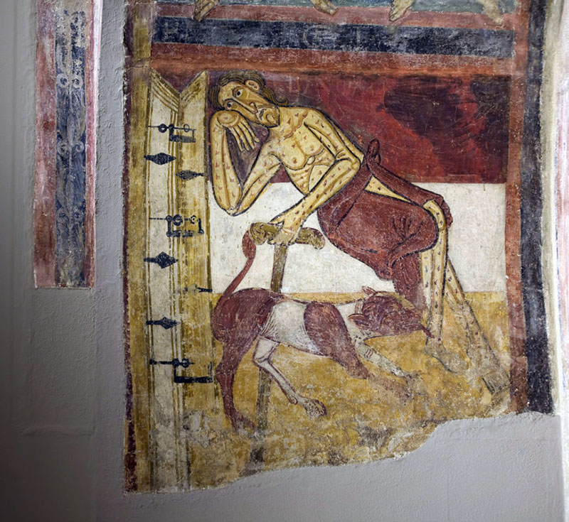 A narrative scene showing the poor man Lazarus, highlighting the artist's ability to tell human stories through rigid forms.