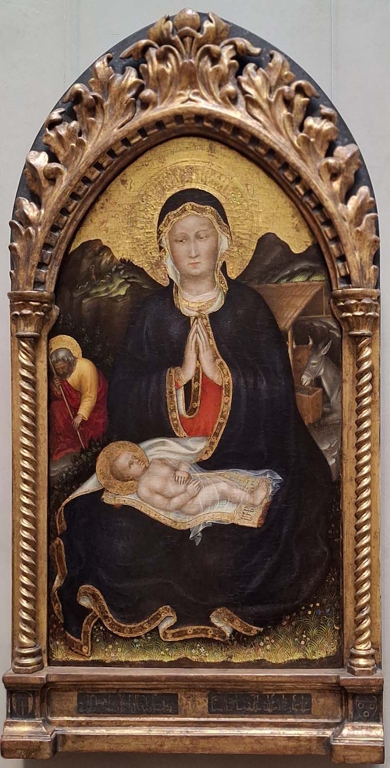 The Nativity About 1420–22 Gentile da Fabriano Italian, about 1370–1427 Tempera and gold leaf on panel The representation of two different Christian subjects in this painting is unusual. The birth of Christ, with the Annunciation to the Shepherds in the left background, is combined with the Virgin Mary, portrayed here as the Madonna of Humility—a type of devotional image in which she sits on the bare earth and adores the Christ Child. The naturalism of the distant, nighttime scene; the flowers in the foreground; and the richly decorated edge of Mary’s garment are typical of the International Gothic style.