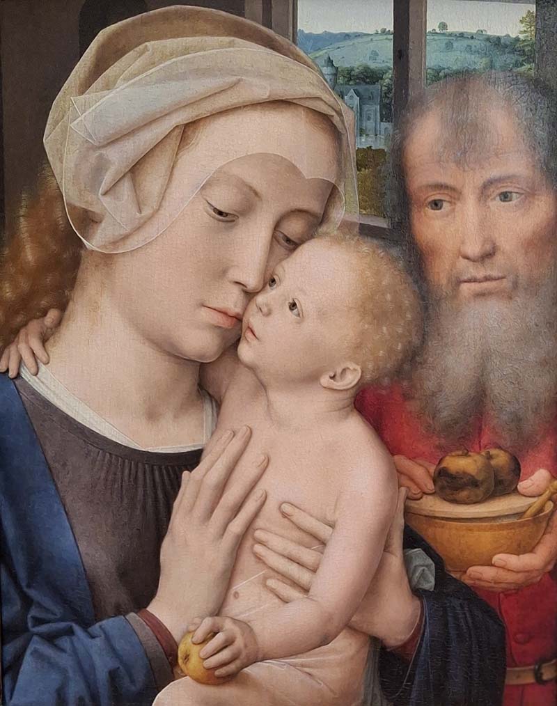 The Holy Family About 1520 Gerard David Netherlands, Oudewater about 1455–Bruges 1523 Oil on panel Gerard David innovatively updated a beloved Christian subject by portraying the Holy Family in a contemporary Flemish home. In keeping with the informal domestic setting, the figures are located close to the viewer, who becomes part of the intimate exchange. The tender embrace between the Virgin and her son conveys their loving bond. Nearby, Joseph holds a bowl of porridge-like milk soup. The apples offer poignant references to what lies ahead: the decayed fruit resting on the lid may allude to Christ’s future sacrifice and death, while the unblemished apple in his hand symbolizes his role as the second Adam, Redeemer of humankind.