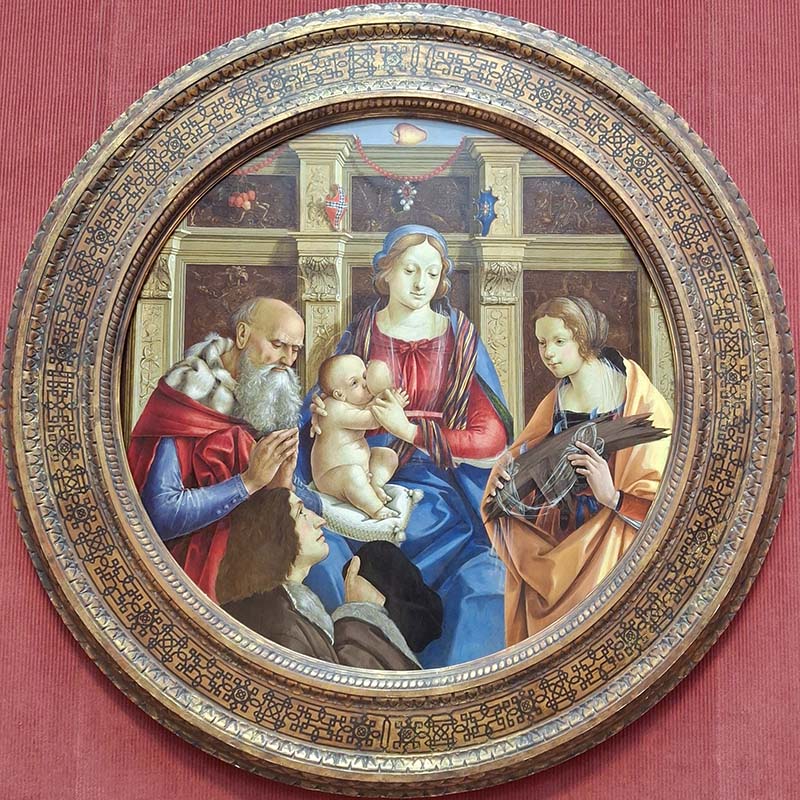 The Madonna and Child with a Male Saint, Catherine of Alexandria, and a Donor About 1496 Michelangelo di Pietro Membrini Italian, Lucca about 1461(?)–1525 Tempera on panel Circular paintings, or tondi, became popular in central Italy during the fifteenth century, often commissioned to celebrate or anticipate a marriage or birth. The coats of arms on the Virgin Mary’s throne belong to the Guinigi and the Buonvisi, two leading families from the Italian city of Lucca. The painting likely commemorates the marriage of the banker Michele Guinigi, shown kneeling before the Virgin and the suckling Christ child, to Caterina Buonvisi. Holding a fragment of a wheel, Caterina assumes the guise of her patron saint, Catherine of Alexandria.