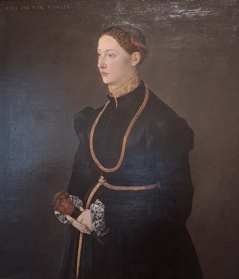 Portrait of Barbara Kressin 1544 Netherlandish Master Active in Germany by 1544 Oil on canvas Richly dressed in a patterned gown, an embroidered collar and cuffs, and a heavy gold chain and belt, Barbara Kressin (age seventeen, according to the inscription at upper right) stands in the contained pose favored for female portraits during the Renaissance. The expensively decorated gloves she holds may refer to the symbolic union of marriage.