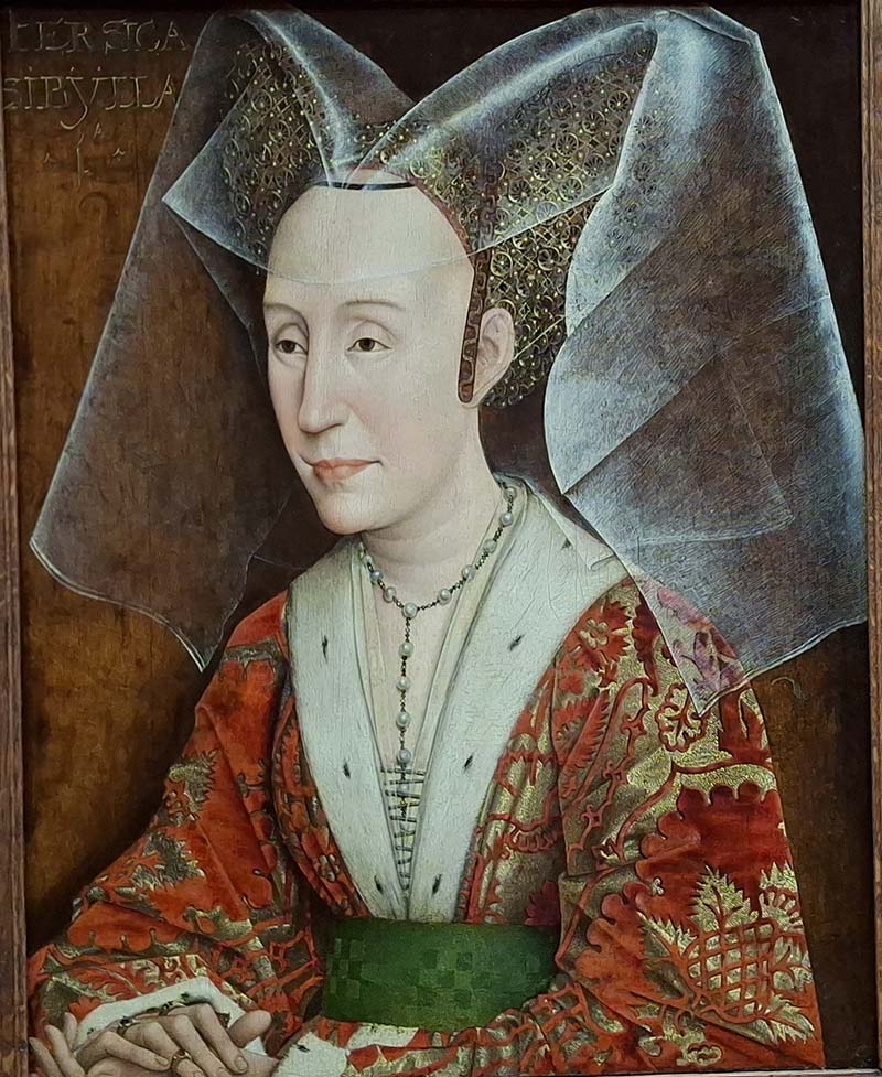 A woman of political ambition and power, Isabella of Portugal (1397–1471) became the third wife of Philip the Good, Duke of Burgundy, in 1430. This work is based on a donor portrait of the duchess from a lost altarpiece. She wears an elaborate jeweled headdress that was the height of court fashion. A much later inscription identifies her as the Persian Sibyl, a female prophet from antiquity.