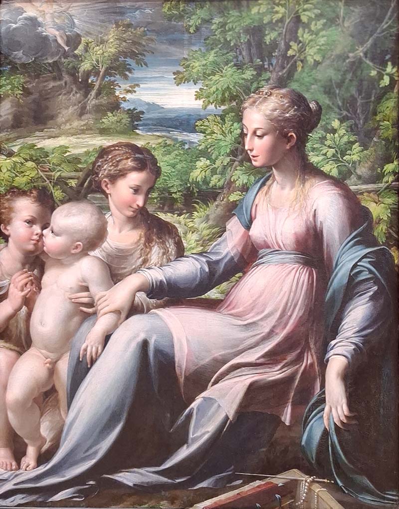 This very well preserved picture is unusually painted on seven sheets of paper laid down on panel. The beautiful seated Virgin is looking at her Child embracing the infant St. John the Baptist, both assisted by Mary Magdalene, who is also represented in the distant background being elevated to heaven. The polished and enamel-like surface, the lush landscape, the refined hairstyles of the two women, the interplay of the hands, and the still life with the jewels of Mary Magdalene in the foreground are characteristic of Parmigianino's manner in his full maturity.