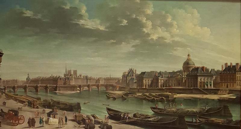 This view from the Right Bank of the Seine depicts the Pont Neuf and the Île de la Cité in the center, with the towers of the Conciergerie on the far left. The towers of Notre Dame Cathedral and the tall spire of the Saint-Chapelle are visible in the far left center. These monuments attracted Grand Tourists—educated men from northern Europe who travelled through France and Italy to complete their education. They commissioned or bought panoramic urban views, such as this work, as souvenirs of their travels.