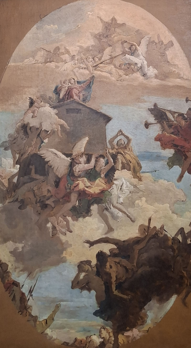 According to a fifteenth-century tradition, the Virgin Mary’s house was miraculously transported from Nazareth in the Holy Land to Loreto, a small town on Italy’s Adriatic coast, when it came under the threat of desecration by invading Saracen armies in 1291. This sketch is the artist’s final preparatory study for the large frescoed ceiling fresco, destroyed by bombing in World War I, in the church of the Scalzi in Venice.