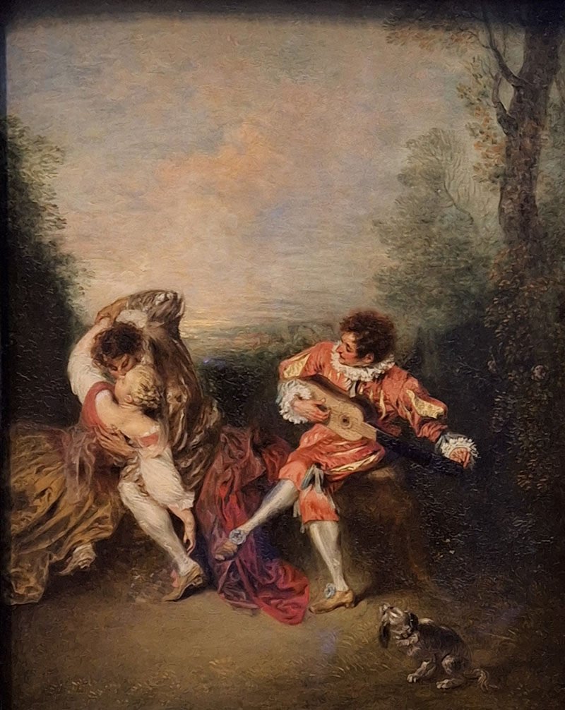 In a verdant park at sunset, a young woman abandons herself to her tousle-haired companion’s ardent embrace. The lovers are oblivious to the third figure, Mezzetin, a character from commedia dell’arte, the Italian comic theater, known for his musical gifts and amorous scheming. Tuning his guitar, Mezzetin observes the couple’s unbridled passion with a melancholy air. Watteau created and defined the genre of the fête galante, evocative outdoor scenes of amorous encounters and entertainment, including music-making. This painting, celebrated by the painter’s contemporaries and rediscovered only recently, is one of the genre’s finest examples.