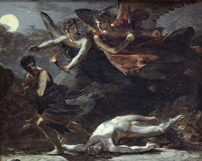 "This lurid, moonlit scene shows Justice, raising her sword, and Divine Vengeance, blazing the way with a torch, in swift pursuit of a murderer fleeing the scene of his crime, bloody dagger still in hand. The work served as a preparatory study for a large allegorical painting, today in the Louvre, that was originally destined to hang behind the judge's bench in the criminal court of the Palais de Justice in Paris. Prud'hon's inspiration was a line from the ancient Roman poet Horace: 'Rarely does Retribution fail to catch up with the criminal' (Odes, Book III)."