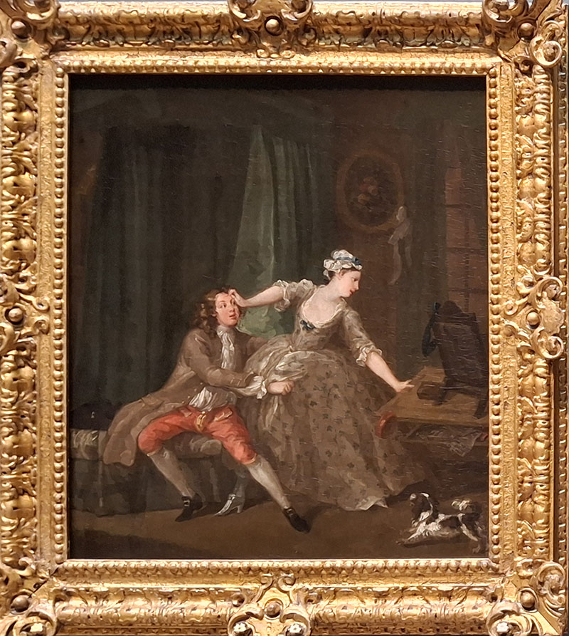 These two scenes tell an uncomfortable story of sexual conquest. In the first, a man aggressively pursues a woman, grabbing at her clothes as she tries to push him away. In the second, with the man's lust now sated, he shows indifference to her attention. Hogarth intended these paintings as a witty and biting comment on human nature and as a provocative response to the anodyne images of courtship popular in early eighteenth-century art. The paintings' humor, however, has soured with time. To the contemporary viewer they likely offer a reminder of injustices perpetrated against women and of deep-seated power imbalances between the sexes.