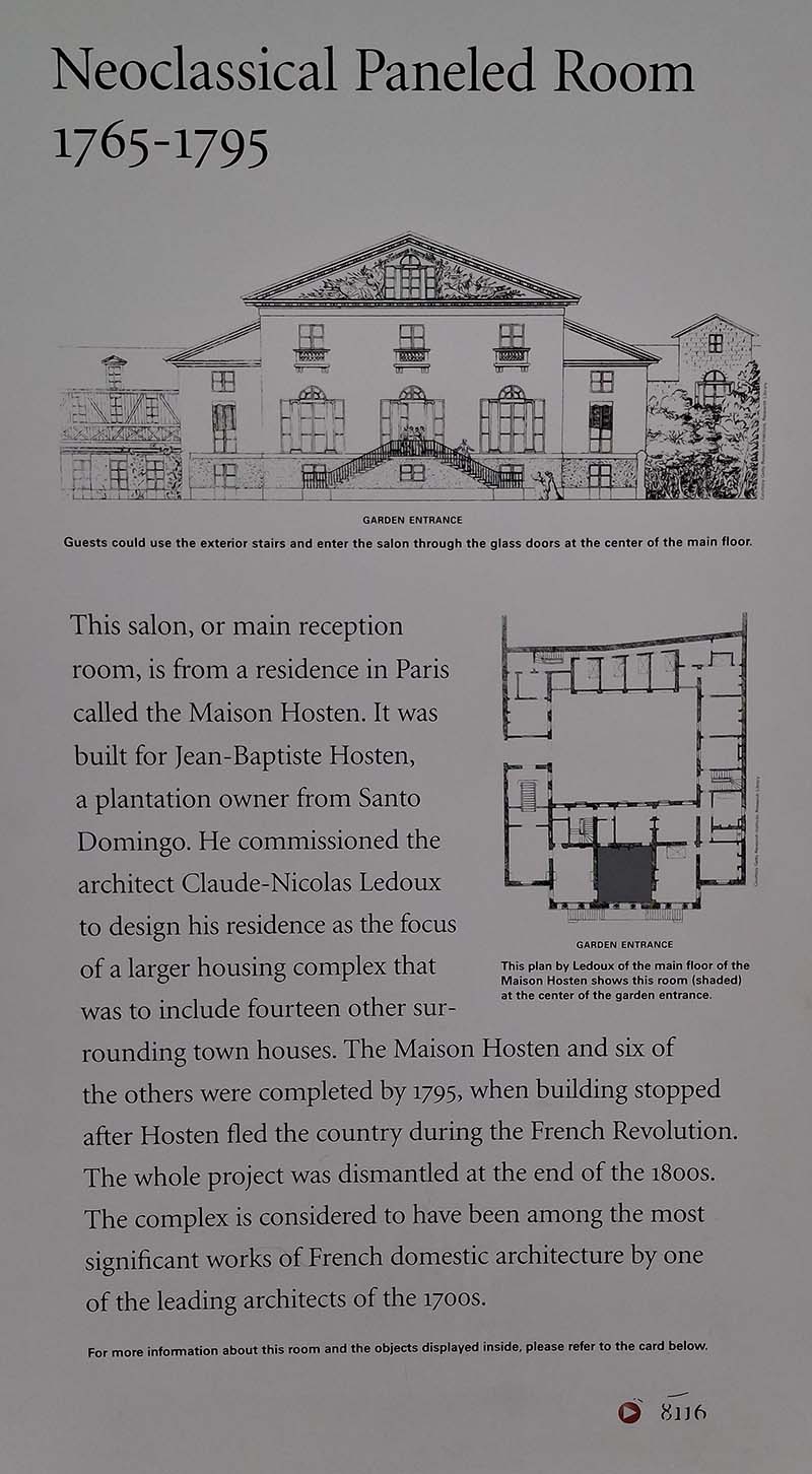 This salon, or main reception room, is from a residence in Paris called the Maison Hosten. It was built for Jean-Baptiste Hosten, a plantation owner from Santo Domingo. He commissioned the architect Claude-Nicolas Ledoux to design his residence as the focus of a larger housing complex that was to include fourteen other surrounding town houses. The Maison Hosten and six of the others were completed by 1795, when building stopped after Hosten fled the country during the French Revolution. The whole project was dismantled at the end of the 1800s. The complex is considered to have been among the most significant works of French domestic architecture by one of the leading architects of the 1700s.