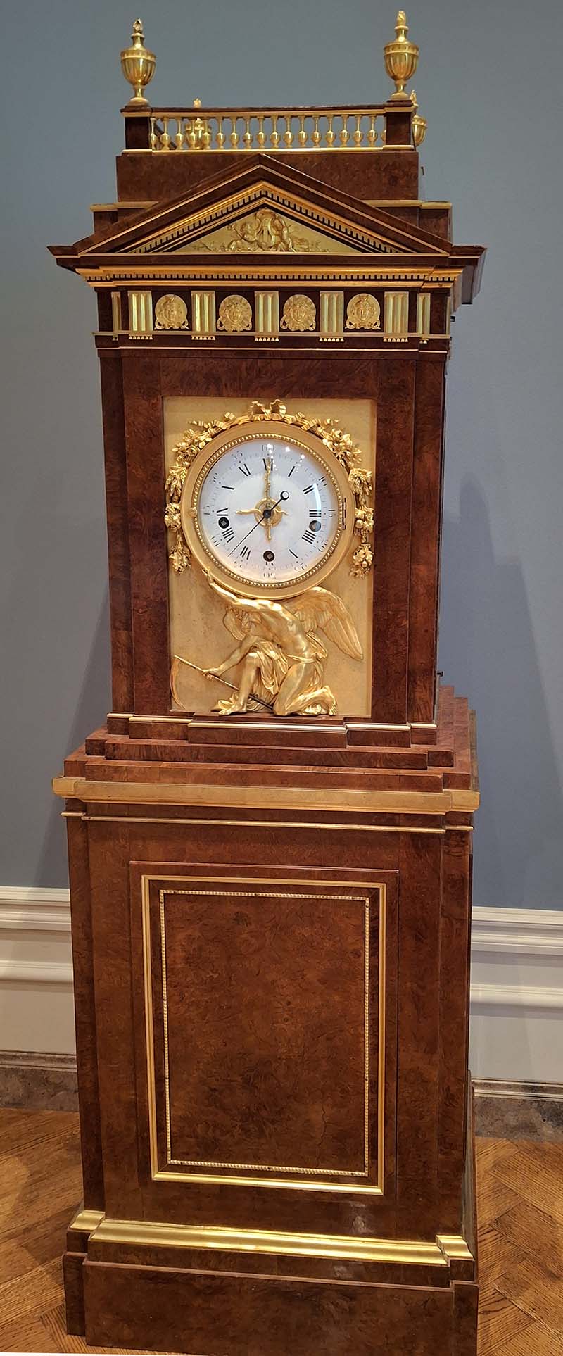 This model of clock was one of the most popular made by Roentgen. The gilt-bronze decoration referring to Time—Chronos (Father Time) supports the clock dial; the passage of the year is marked by the garland over the dial, with flowers for spring, wheat for summer, grapes for autumn, and holly leaves for winter; the faces of day and night are shown in the roundels above; and the whole is crowned with the lyre of the mythological god Apollo, who oversees the passage of time. Several comparable examples even include a gilt-bronze figure of Apollo on top.