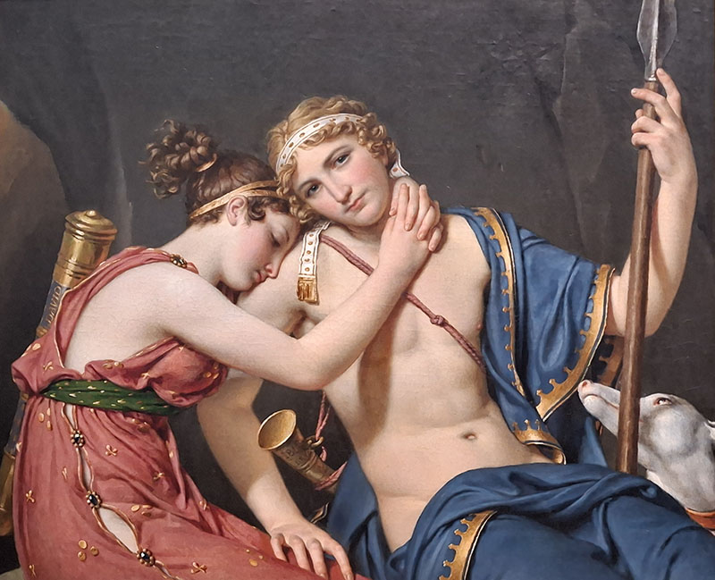 This image of ideal love was inspired by a 1699 French novel based on characters from Homer's Odyssey. Telemachus, the son of Odysseus, falls in love with the nymph Eucharis. Filial duty, however, requires that he end their romance in order to search for his missing father. The bright reds and blues contrasting with the cool flesh tones, the clarity of line, and the polished forms are characteristic of David's late paintings.
