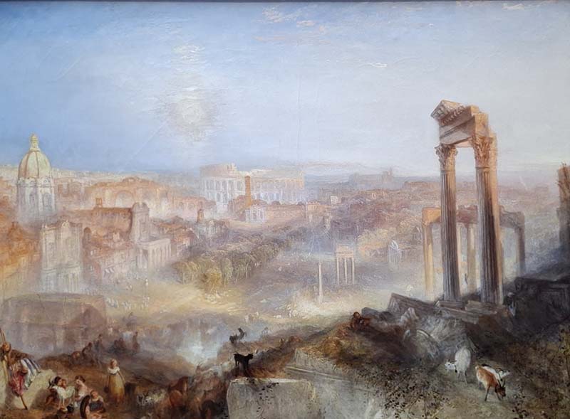 Ten years after his final journey to Rome, Turner envisioned the Eternal City through a shimmering veil of memory and imagination. Baroque churches and ancient monuments in and around the Roman Forum seem to dissolve in iridescent light shed by a moon rising at left and a sun setting behind the Capitoline Hill at right. Amidst these splendors, the city's inhabitants carry on with their daily activities. Untouched since it left Turner’s hands, the painting is in a remarkable state of preservation. It is shown here in the frame originally chosen by the artist.