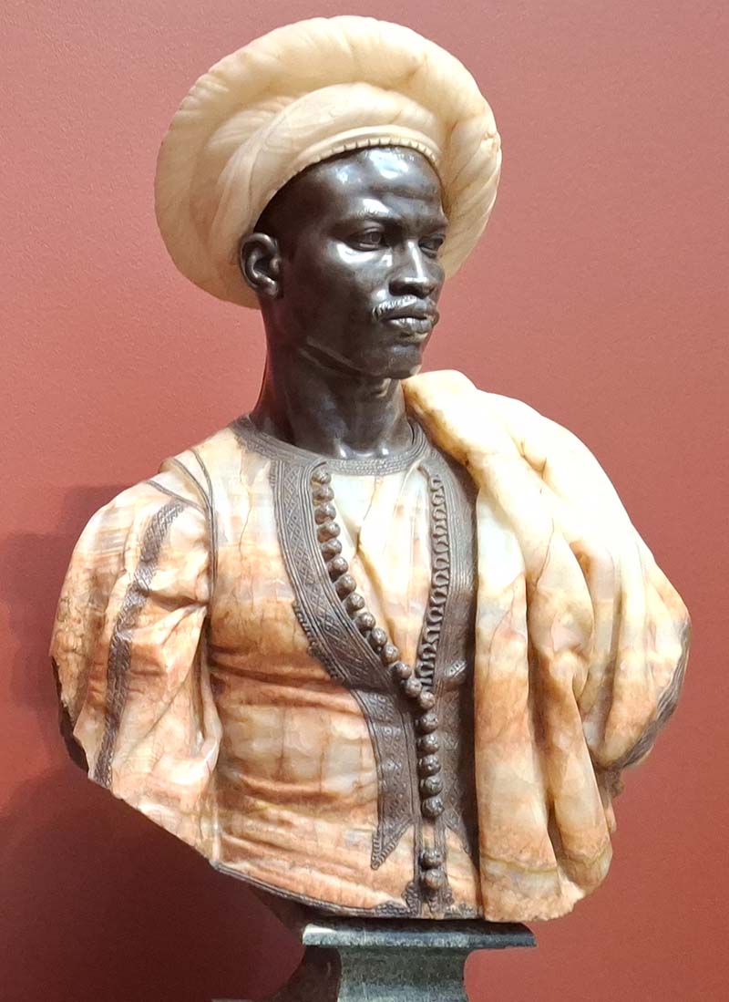Text: The sitter, a native of Sudan whose name is unrecorded, was a percussion player for Muslim religious festivities. He lived in Algiers, Algeria, where the artist portrayed him in 1856. Cordier was among the first artists in Europe to revive a taste for sculptures made with a colorful combination of materials. He innovatively applied his artistic skills to the nascent field of ethnography, which at that time used racialized terms, as in this bust's historic French title.