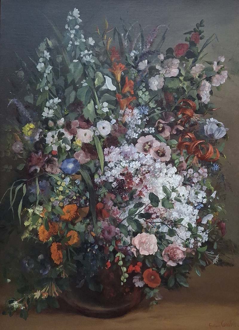 In the summer of 1862, Courbet began painting flower pictures during a happy sojourn in the Saintonge region of southwestern France. In a generous, bursting display that suggests a spontaneous gathering rather than careful arrangement of flowers, this bouquet intermingles many of the common garden varieties and exotic hothouse blooms that were available to Courbet at the estate of his host, the collector Etienne Baudry. The artist sold the painting fresh off the easel to Baudry's friend Frédéric Mestreau, a local banker and cognac wholesaler. Appreciating the commercial value of still-life painting, Courbet frankly admitted: "Flowers are making me a mint."