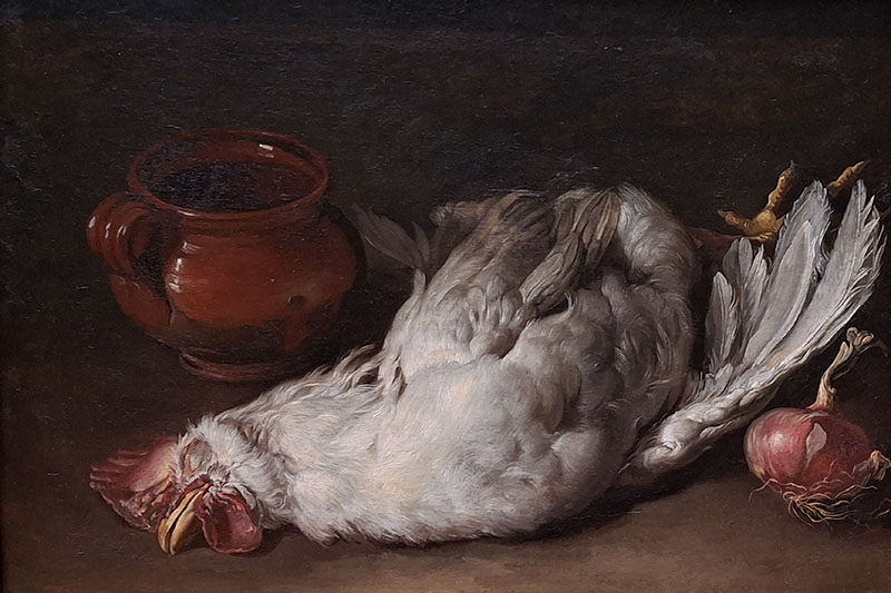 Text: Against a dark background, Ceruti meticulously portrayed some foodstuffs from a larder. A clear, bright light reveals the brittle onion skin and the soft plumage of the hen. The white Livornese chicken, a breed still common in Italy, is particularly valued for its high level of egg production. The prominent positioning of the hen's body invites close inspection, encouraging the viewer to contemplate the beauty of its still form. The attentive rendering of the rigid foot, stiff wing, and open beak conveys respect, almost sacred significance, toward the dead creature.
