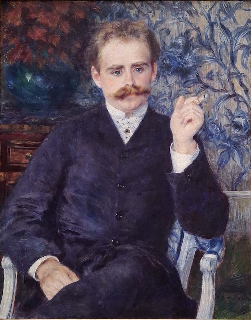 By the early 1880s, Renoir had achieved some success as a portraitist of the social elite. The subject here is orchestral composer Albert Cahen d’Anvers (1846–1903), a member of a wealthy banking family. Fastidiously dressed, with an elegant cigarette holder in his hand, he sits nonchalantly in an eighteenth-century armchair before a vase of dahlias and some exuberant floral wallpaper. The setting is the salon at Wargemont, a chateau in Normandy owned by the diplomat and banker Paul Berard, a devoted patron and frequent host of Renoir. An inscription at lower right specifies the location and indicates the date Renoir completed and signed the portrait: September 9, 1881.