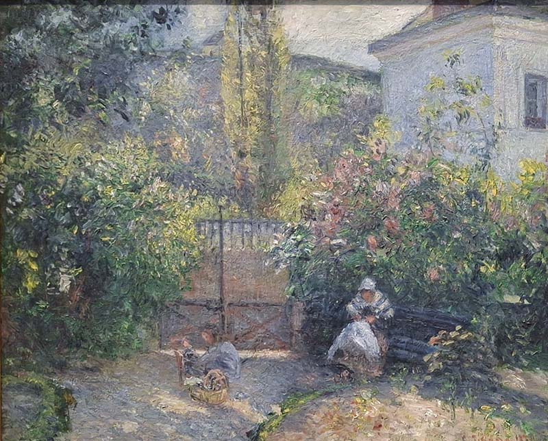 Pissarro once commented that his art was not designed for the hurried viewer. Densely packed with brushstrokes applied with varying degrees of force and energy, this canvas is richly encrusted with painterly detail. The garden’s inhabitants—a child at play and an older woman bent over her sewing—each absorbed in quiet activity—epitomize the intense concentration with which Pissarro believed his paintings should be viewed.