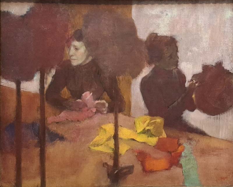 Fascinated by the millinery trade, Degas made numerous images of female hat makers and buyers. This strikingly austere late work was continuously rethought and repainted over the course of twenty-five years. What began as an image of shoppers was transformed into a complex, poignant double portrait of workers. The figures are intentionally rendered with varying levels of finish—the woman at left is more fully realized than her shadowy counterpart. Degas’s process here was to continually reduce anecdotal details down to the looming hat stands and vibrant ribbons. The final product is thoroughly modern in sensibility, composition, and technique.
