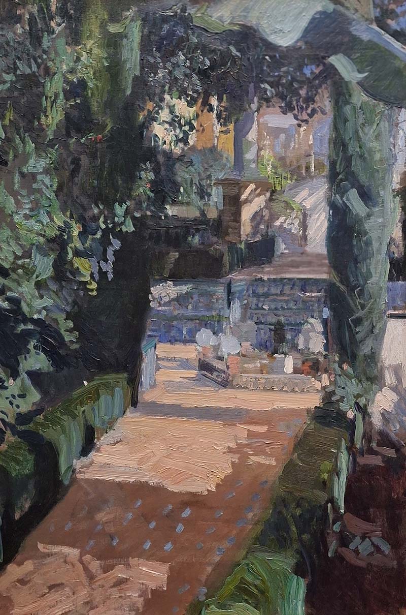 Sorolla's dedication to painting outdoors is evident in his masterful treatment of dappled light in this lush garden scene, one of several he painted on site in Seville. Along with the Hall of the Ambassadors, Alhambra, Granada (nearby), this painting is one of only a few from J. Paul Getty's personal collection that hang in the museum's galleries, most of the collection having been formed after his death. As Mr. Getty wrote: "I was struck by the remarkable quality of Sorolla's paintings, being especially fascinated by his unique treatment of sunlight."